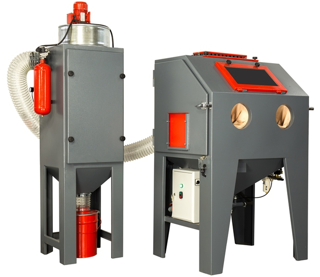 Для обдува обработанных деталей и сдувания абразива с других поверхностей, камера оборудована обдувочным пистолетом.